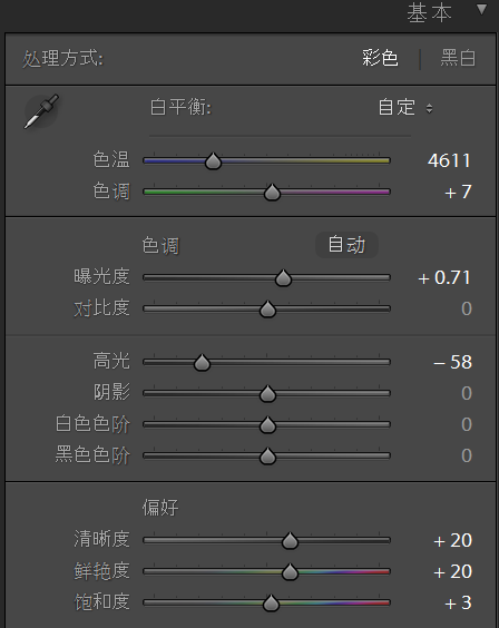 1、基本調整:調整白平衡,适當降低色溫,可(kě)以讓畫面色彩更幹淨些。适當加曝光,同時減高光。